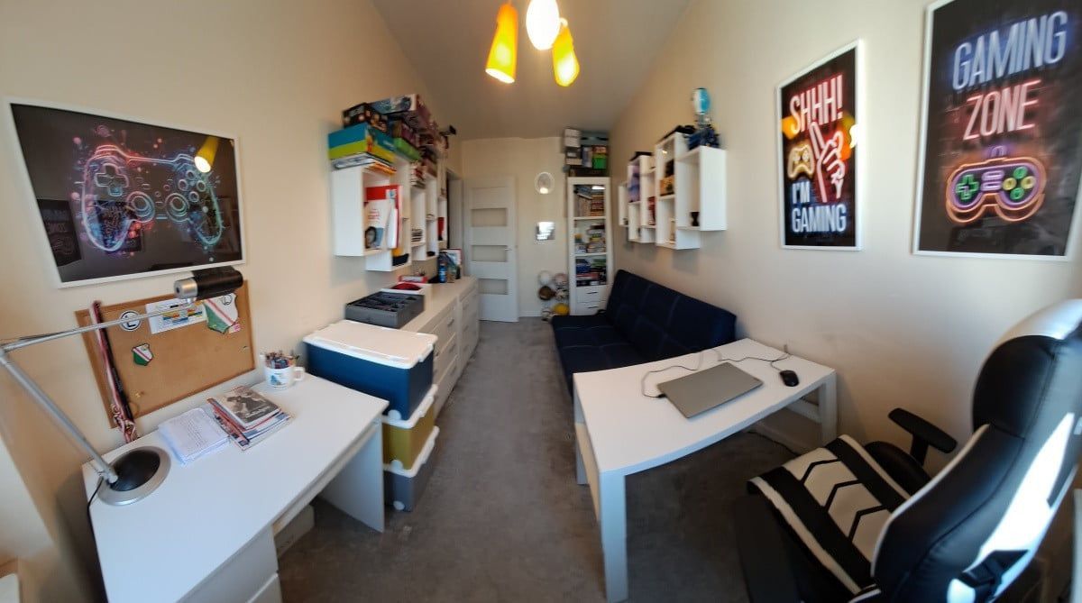 Pokój dziecięcy (10,35 m2): wykładzina dywanowa, pod którą są ułożone 2 warstwy płyt z kory dębowej. W oknach rolety plisowane.