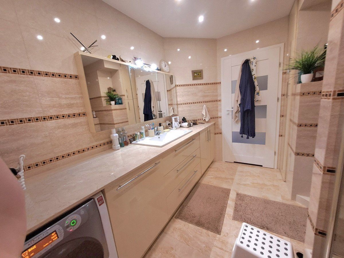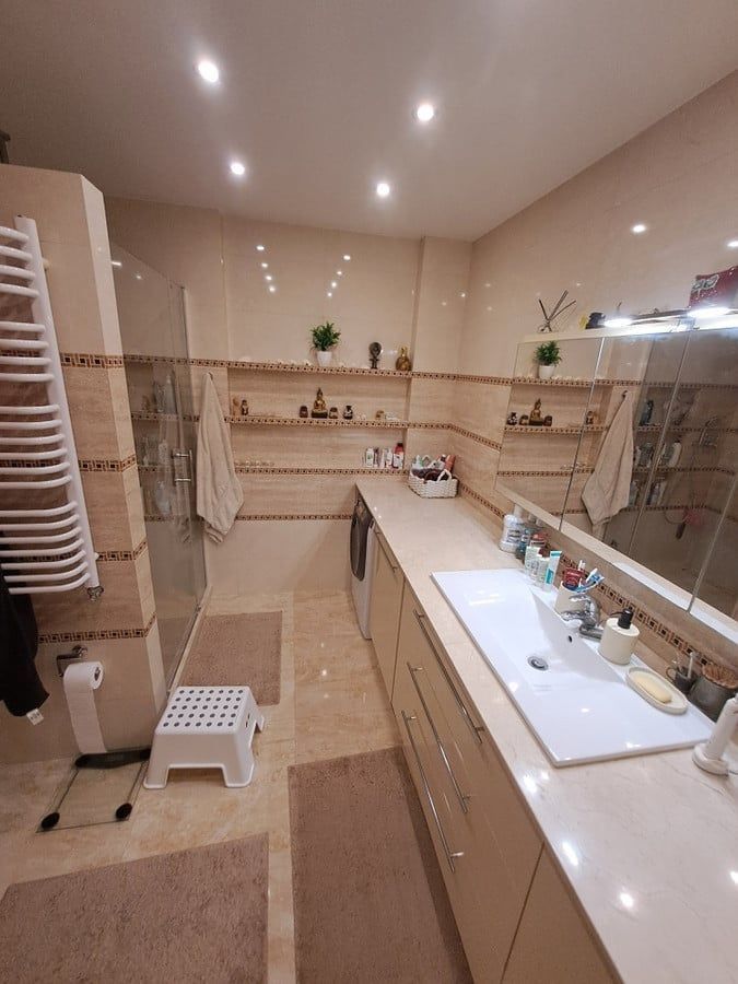 Duży prysznic o szerokości 110 cm i głębokości 100 cm, z półkami. Pralko suszarka.