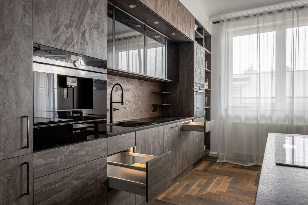 Meble kuchenne- stolarka na zamówienie, granitowe blaty w kuchni, sprzęt AGD BOSCH, ekspres do kawy w zabudowie, szuflada podgrzewająca naczynia!