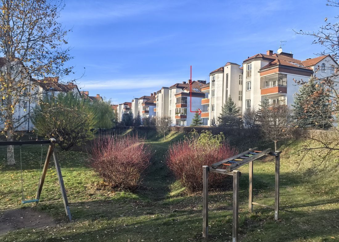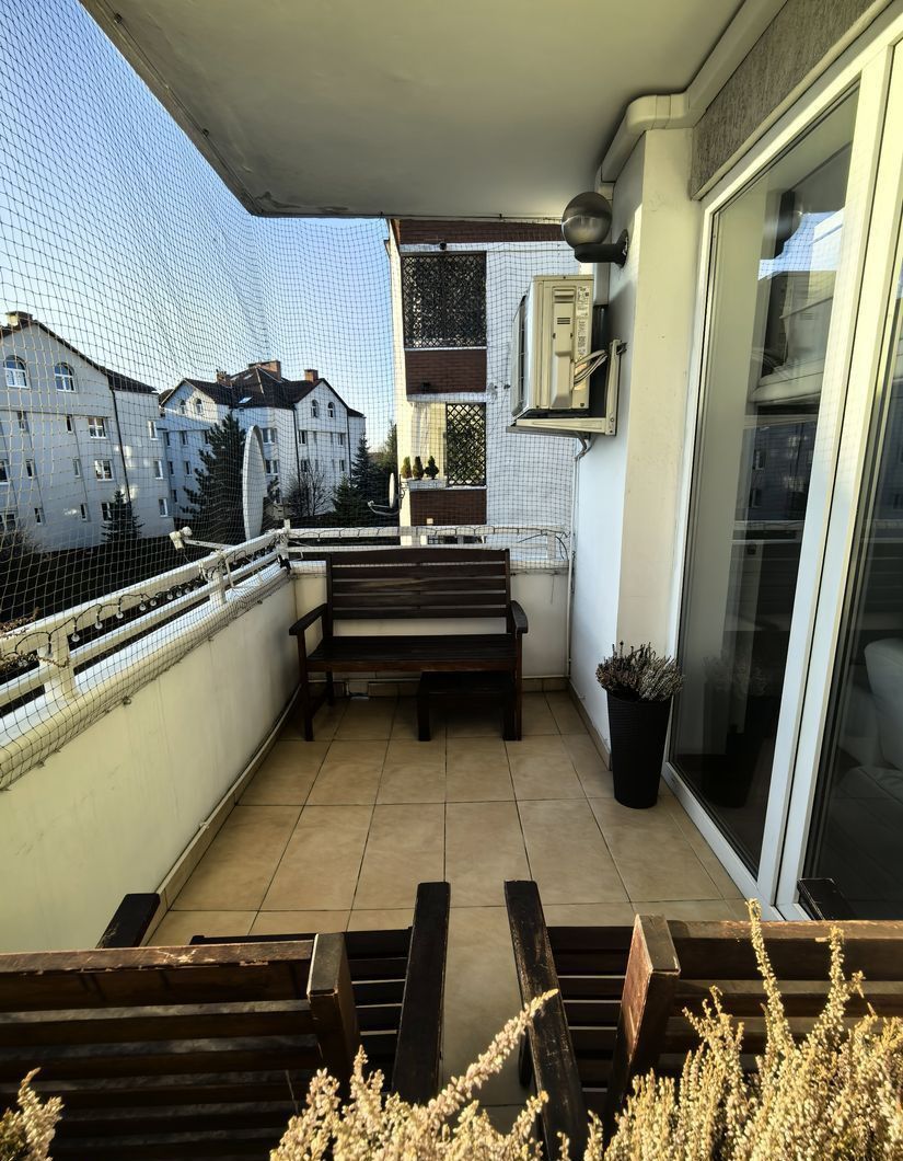 Apartament jest trójstronny okna wychodzą na południe, zachód i północ. Widok z balkonu na osiedlowy teren zielony.