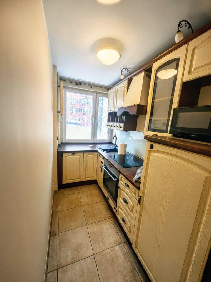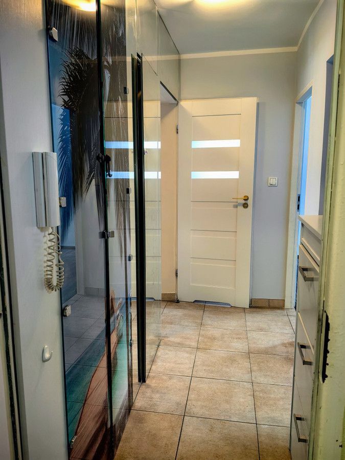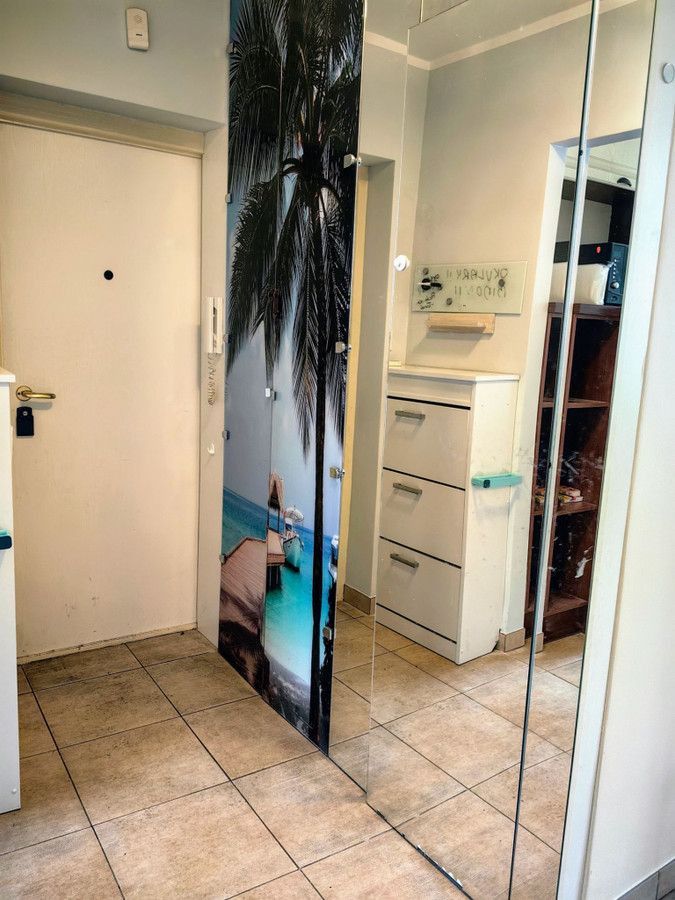Mieszkanie jest dwustronne (wschód-zachód) i bardzo ustawne: salon (wschód) wyposażony w skórzaną kanapę, stół i szafy robione na wymiar (ubraniowa + biblioteczka)., zaś sypialnia i kuchnia (zachód) bardzo dobrze doświetlone popołudniami.